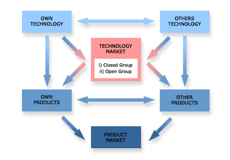 In the absence of such a market, companies face difficult trade off decisions armed with low information probability distributions in allocating R&D investment. Which technology development path to follow and how to source technology are prime corporate decision issues. Reduced technology development effort may increase current profitability at the expense of long term positioning. Out sourcing technology may have a similar effect in reducing the value added ownership element in a firm's products. On the other hand, technology embodied in capital equipment, in infrastructure, in human education and in industrial process design has long been acquired from external commercial suppliers and from the public domain. The following diagram shows a typical choice set along the value chain of an industry sector.